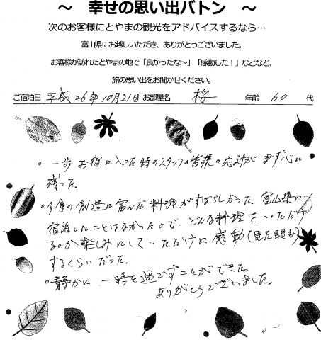 [宿泊日]2014.10.21 [お部屋]桜 [年齢]60代・一歩お宿に入った時のスタッフの皆さまの応対がまず心に残った。・夕食の創造に富んだ料理がすばらしかった。富山県に宿泊したことはなかったので、どんな料理をいただけるのか楽しみにしていただけに感動(見た目も)するくらいだった。・静かに一時を過ごすことができたありがとうございました。