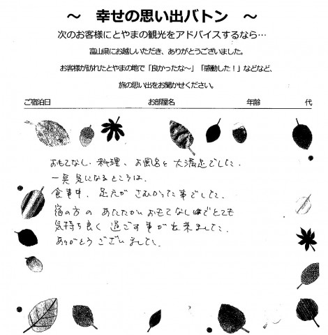 おもてなし、料理、お風呂と大満足でした。一点気になるところは、食事中、足元がさむかった事でした。宿の方のあたたかいおもてなしでとても気持ちよく過ごすことができました。ありがとうございました。