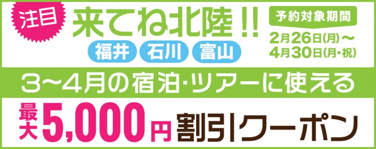 から3~5月の宿泊に使える北陸旅行を応援する割引きクーポンが発行されています!先着利用の枚数制限がありますので、ご利用されたい方はお早めにご活用ください♪
